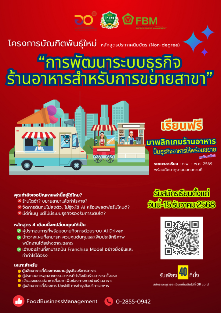 #PIM #FBM #CRM #มหาลัยสร้างตัว #พลิกเกมร้านอาหาร #เรียนฟรี #ธุรกิจอาหาร #แฟรนไชส์ #AISystem #FoodBusinessManagement #โครงการบัณฑิตพันธุ์ใหม่ #Upskill